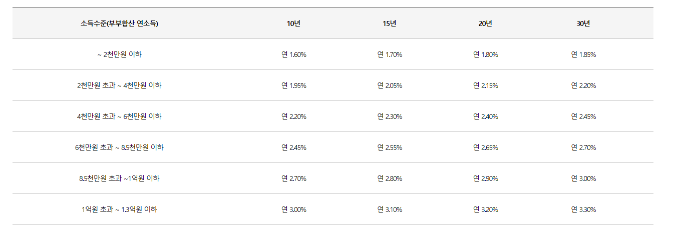 | 소득기준에 따라 | 부부합산 소득 8.5천만원 이하 : 연 1.6%~2.7% 부부합산 소득 8.5천만원 초과 1.3억원 이하 : 연 2.7~3.3% |