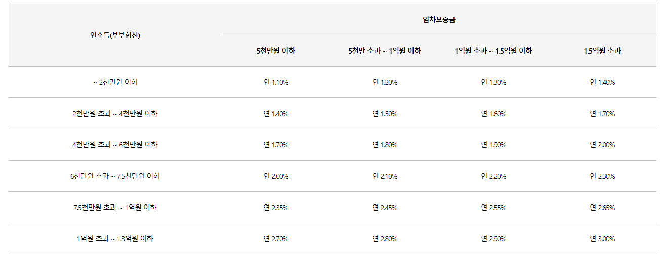 부부합산 소득 7.5천만원 이하 : 연 1.1~2.3% 부부합산 소득 7.5천 만원 초과 1.3억원이하 : 연 2.3~3.0% |