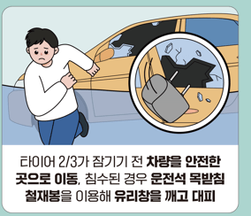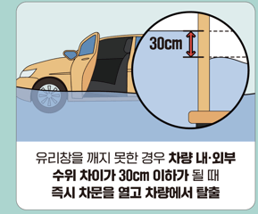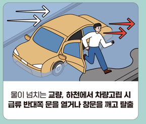 ● 지하차도 진입 금지 : 침수가 시작된 지하차도에는 진입하지 않습니다. 만약 진입한 경우 차량을 두고 몸만 빠져나와 신속히 대피하고, 차량의 비상점멸등을 켜서 위험을 알립니다.