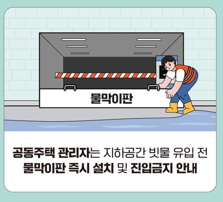 ● 지하주차장에 물이 조금이라도 차오르면 차량을 두고 즉시 탈출합니다. 경사로를 따라 물이 들어오기 시작하면 차량은 두고 몸만 대피합니다. 차량 확인을 위한 지하주차장 진입은 금지합니다.