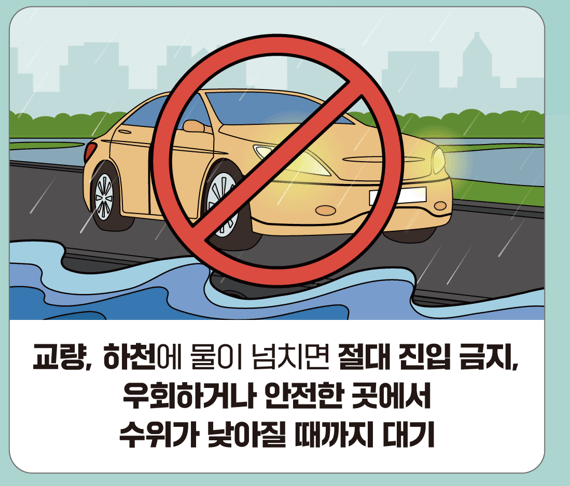 ● 침수 지역 접근 금지 : 침수 지역은 물의 깊이나 도로 상태기 눈으로 보이지 않아 직접 확인할 수 없고 밤에는 더욱 위험합니다. 물이 혼탁하면 위험한 물건에 의해 부상을 입을 수 있습니다