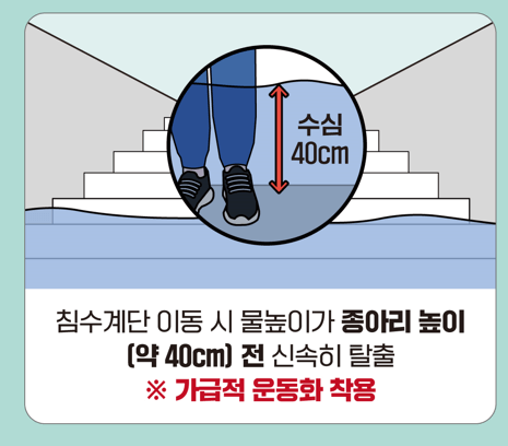 ● 지하계단 : 계단에 유입되는 물이 발목 높이 (30cm 정도)라도 어린이나 노약자는 대피가 어려우니 조금이라도 물이 유입된다면 즉시 대피합니다.