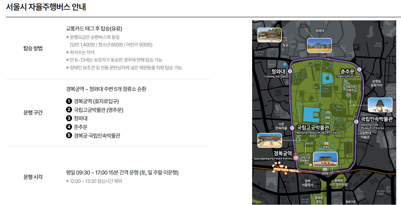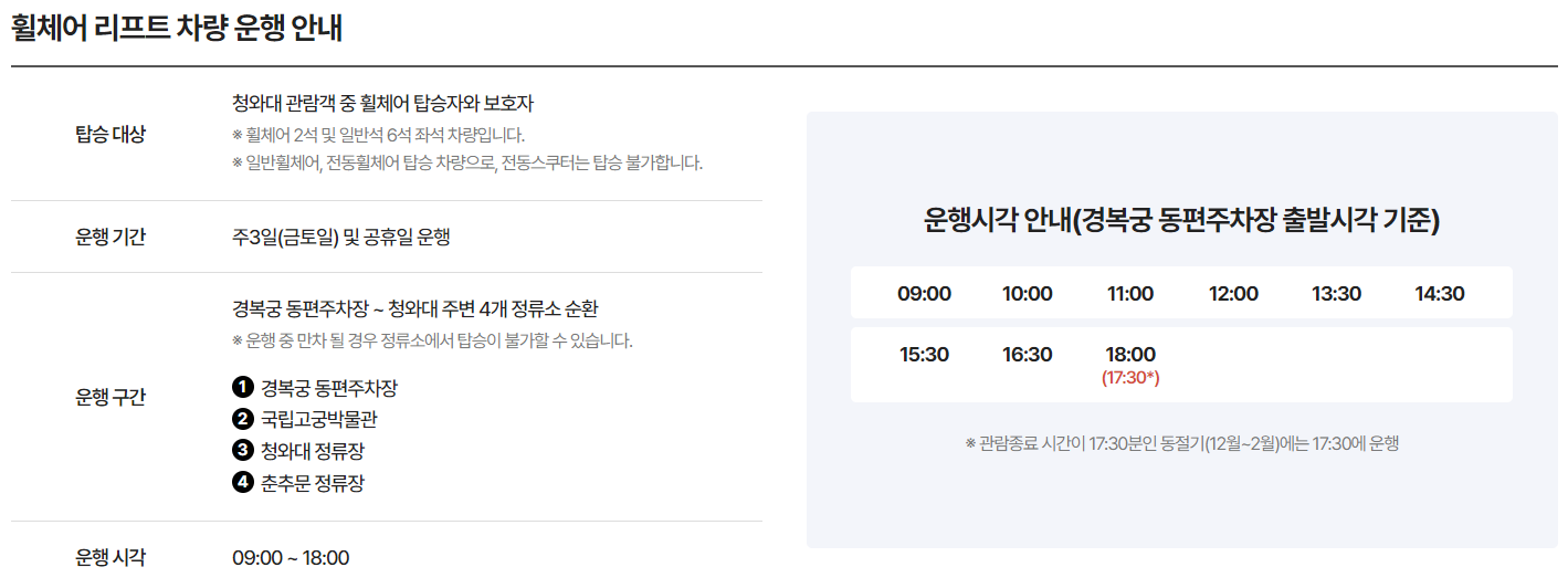 청와대 관람을 위해 대중교통과 개인 차량을 이용하시는 경우 모두 청와대 셔틀버스를 이용하시면 편리하게 다녀오실 수 있습니다.