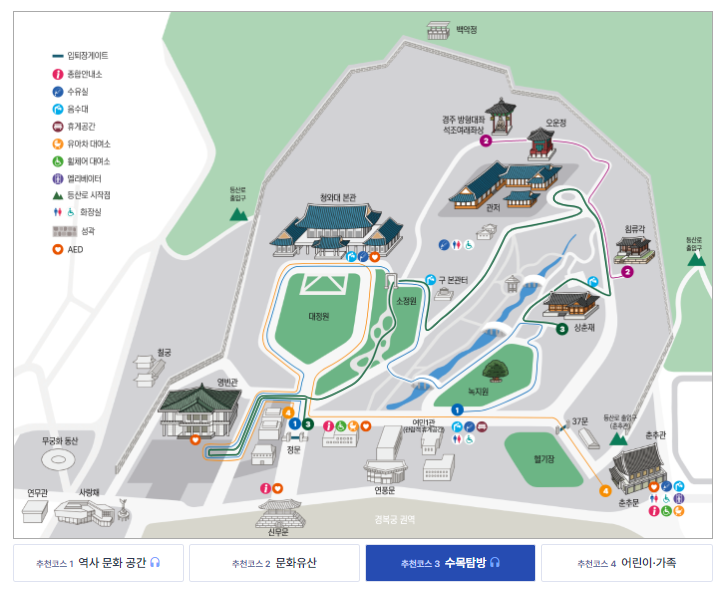 | 추천 2코스 문화유산 (약 30분 ) | 침류각 ➡️오운정➡️ 경주 방형대좌 석조여래좌상 |