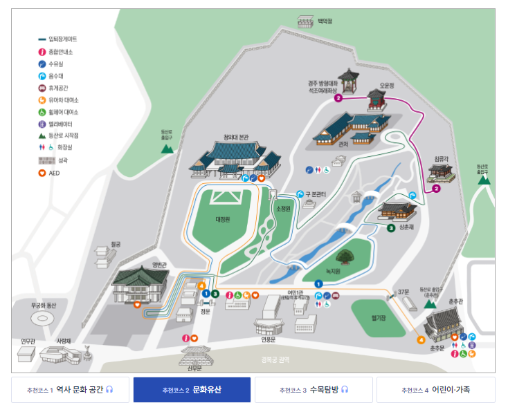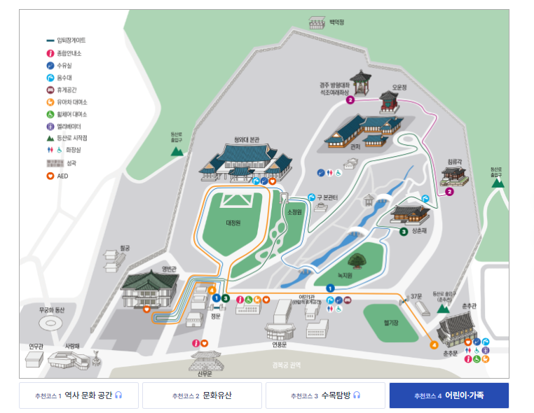 | 추천 4코스 어린이 또는 가족(약 30분 ) | 정문 ➡️영빈관 ➡️ 본관 ➡️녹지원 ➡️춘추관 |