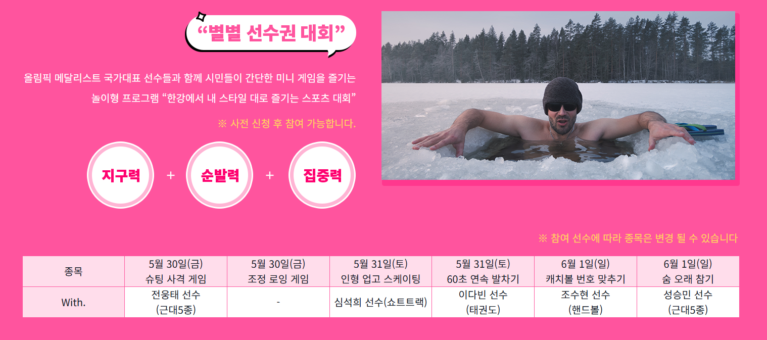 | 6/1(일) | 캐치볼 번호 맞추기, 숨 오래 참기 | 조수현 (핸드볼), 성승민 (근대5종) |