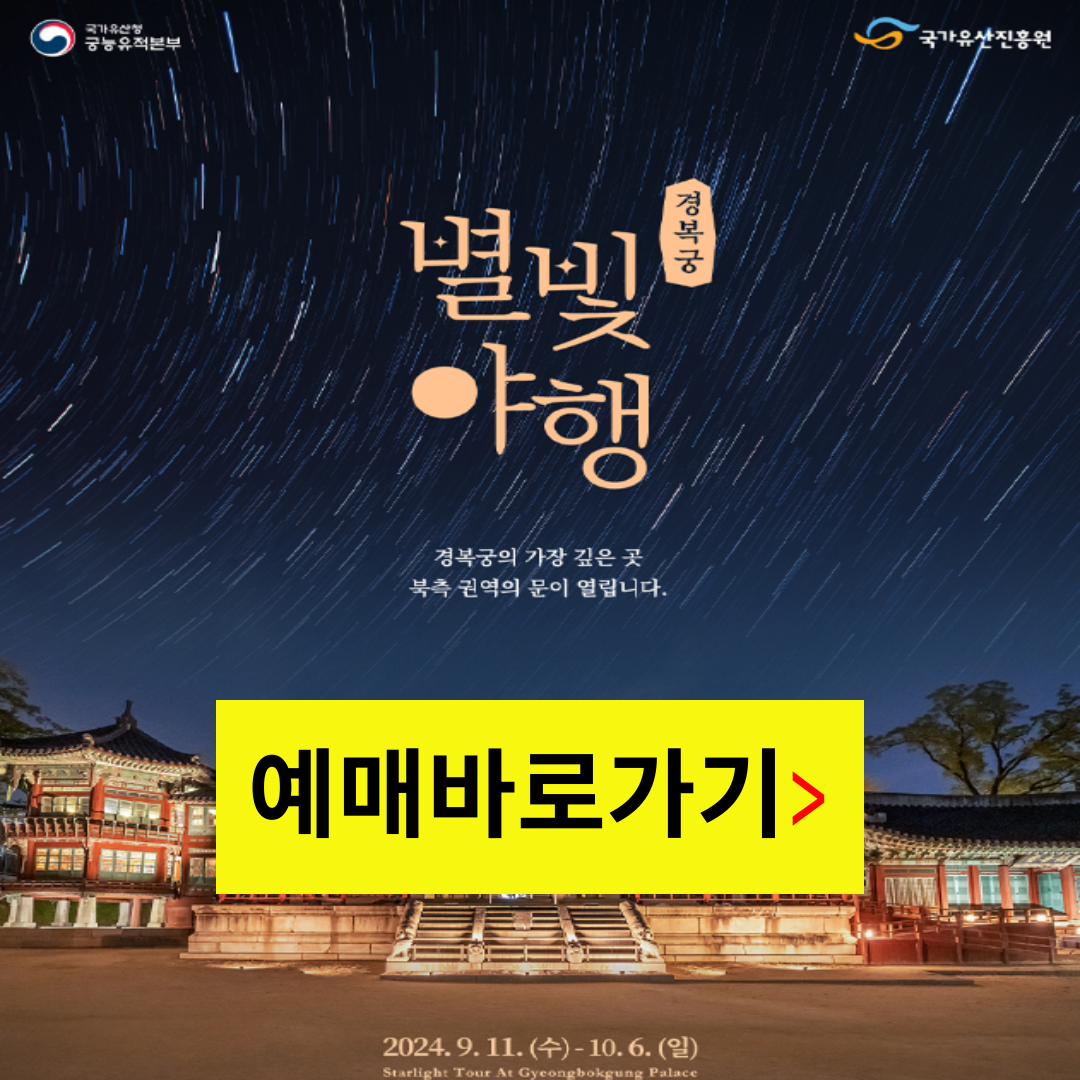 별빛 야행 프로그램지금 신청하기 경복궁 별빛야행은 상반기와 하반기로 나누어 진행됩니다. 상반기는 4월 경 하반기는 9월 에 진행됩니다. 별빛 산책로를 따라 걷고 도슭수라상을 접할 수 있는 기회를 놓치지 마세요. 경복궁 별빛야행은 하반기부터 추첨제로 예매가 이루어지는데요, 지금은 잔여석 예매만 있으니 소진되기 전에 빠르게 예매 진행해보시기 바랍니다. 예매 바로가기👆 경복궁 별빛 야행 예매바로가기 응모기간에 당첨된 분들에게 선예매의 기회를 주고 나머지 잔여석에 대해 예매를 진행하기 때문에 응모를 못하신 분들은 잔여석 예매를 하시면 됩니다. #추첨제 일정● 응모기간: 2024년 8월 22일(목) 14:00 ~ 8월 26일(월) 23:59● 당첨자 발표: 2024년 8월 29일(목) 14:..